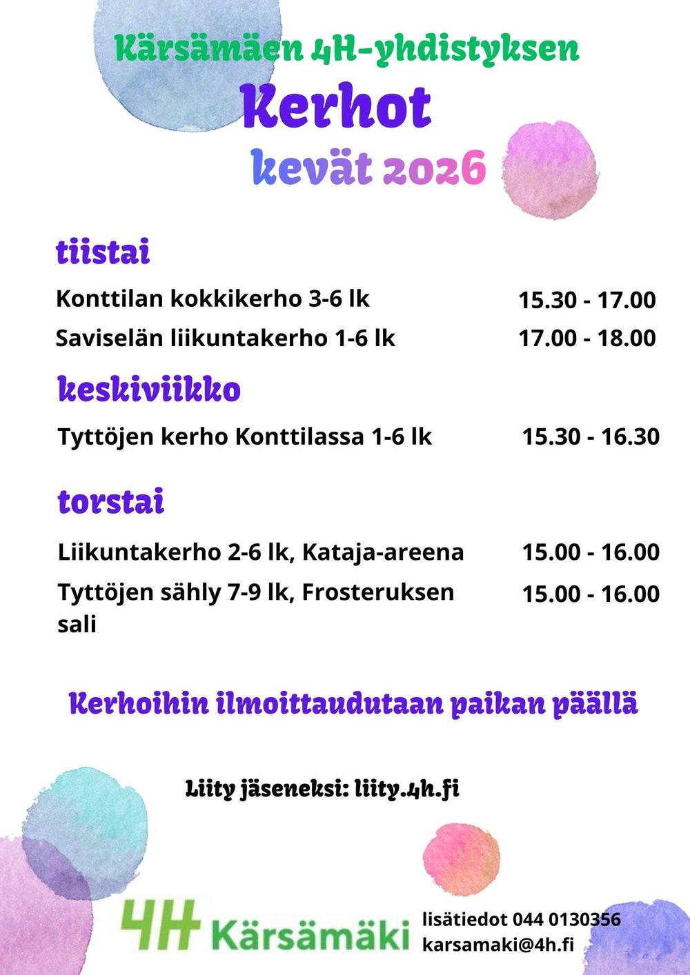 Opetellaan erilaisia taitoja, tutustutaan lähiympäristöön, metsään ja luontoon. 4H-kerho on iloista toimintaa, parhaita kavereita ja yhdessä viihtymistä. Kerhoon voi tulla turvallisin mielin, sillä ohjaajina toimivat koulutetut kerhonohjaajat.